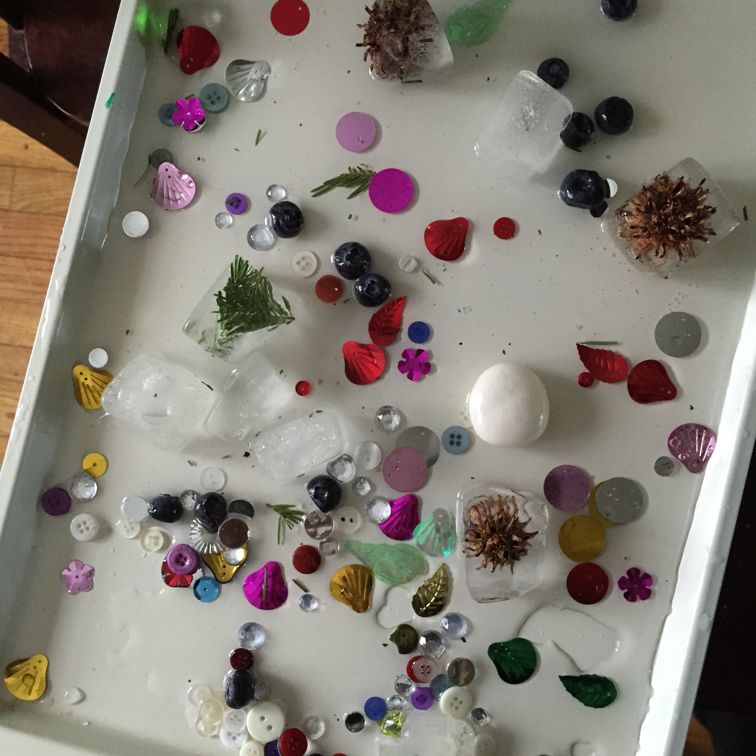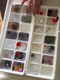 Playing with the cubes continued and we observed as the ice melted, making more and more water as well as trying to scrape and pull out the items that had been frozen in place.