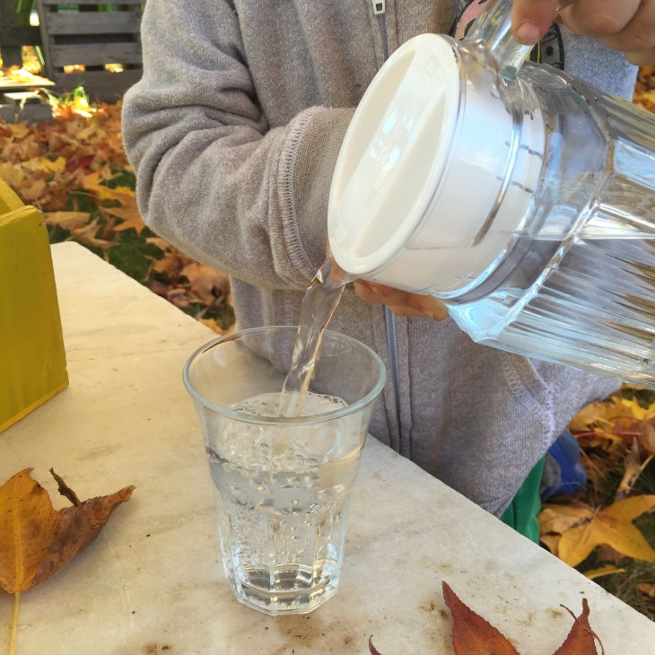“This one a little too fill up.” It’s good for little ones to test just how far they can pour before over flowing or to figure out an appropriate water level to prevent spillage when trying to drink. Making mistakes and pouring too much in a fun activity like this, will help them when it’s time to pour a drink at the dinner table.