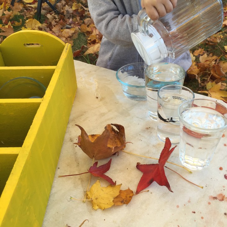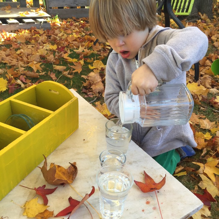 We cleaned up our pouring materials and proceeded to collect some leaves. After a few minutes I noticed this sweet guy was laying out some yellow leaves with great precision and then he set up the pitcher and two glasses and invited me over for a drink. ❤