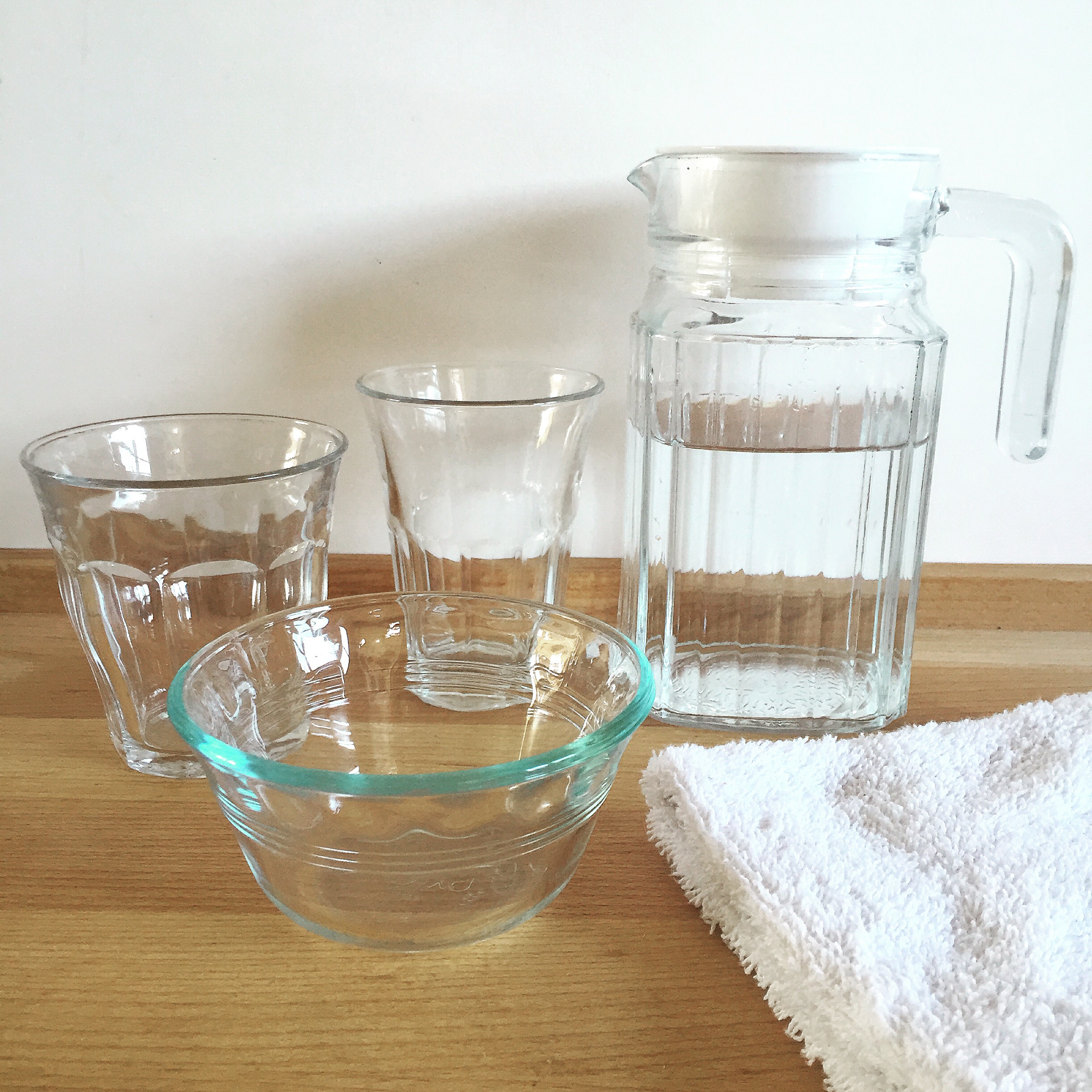Pouring is always a fun activity for little people and this pitcher is perfect for little hands. I grabbed some glasses, bowls and washcloths, of course, and filled the pitcher with water.