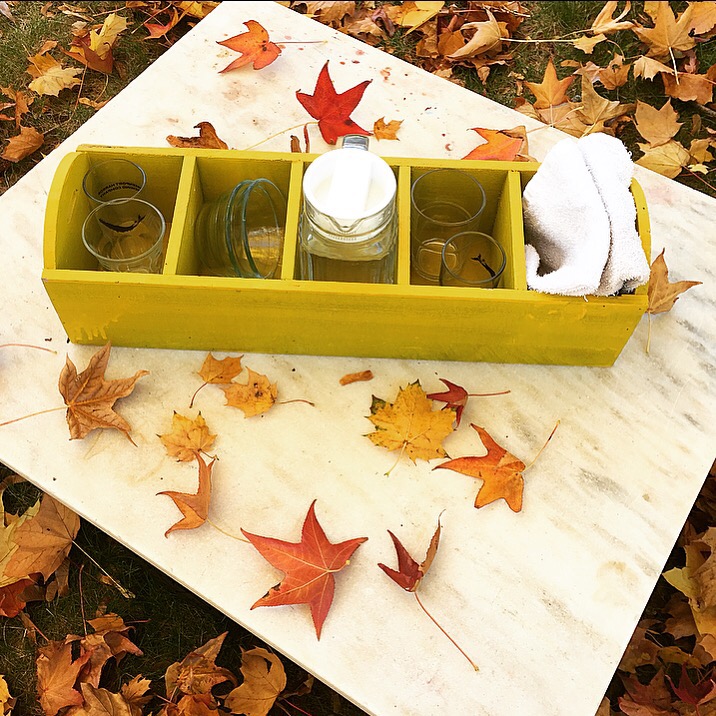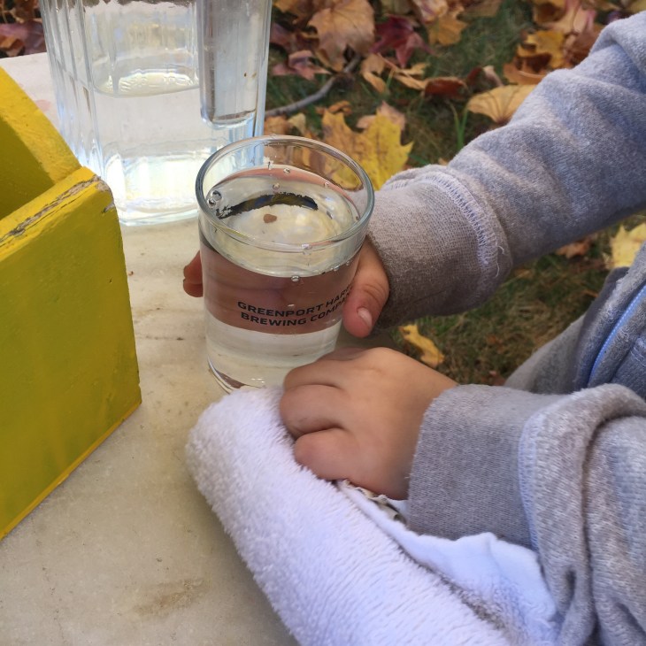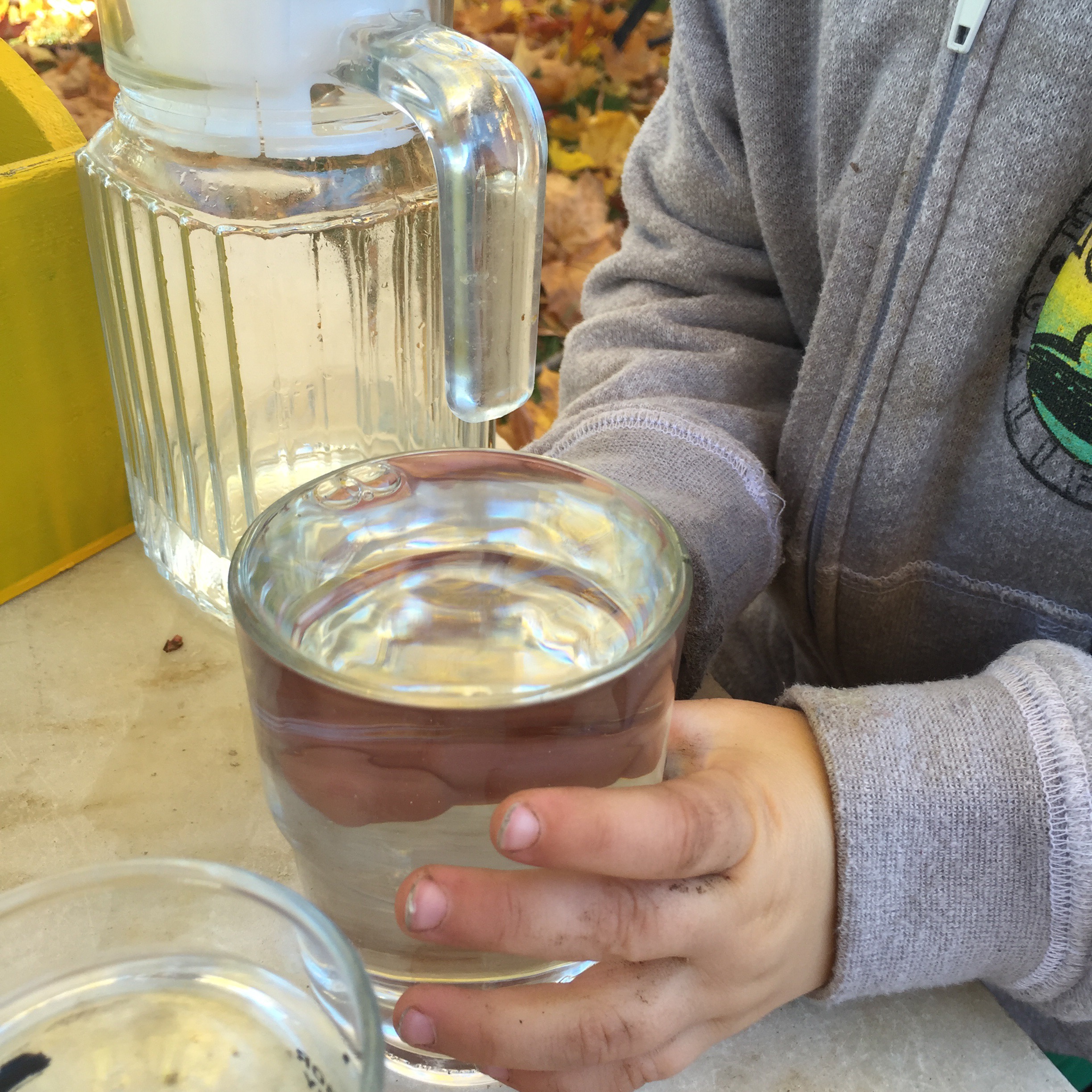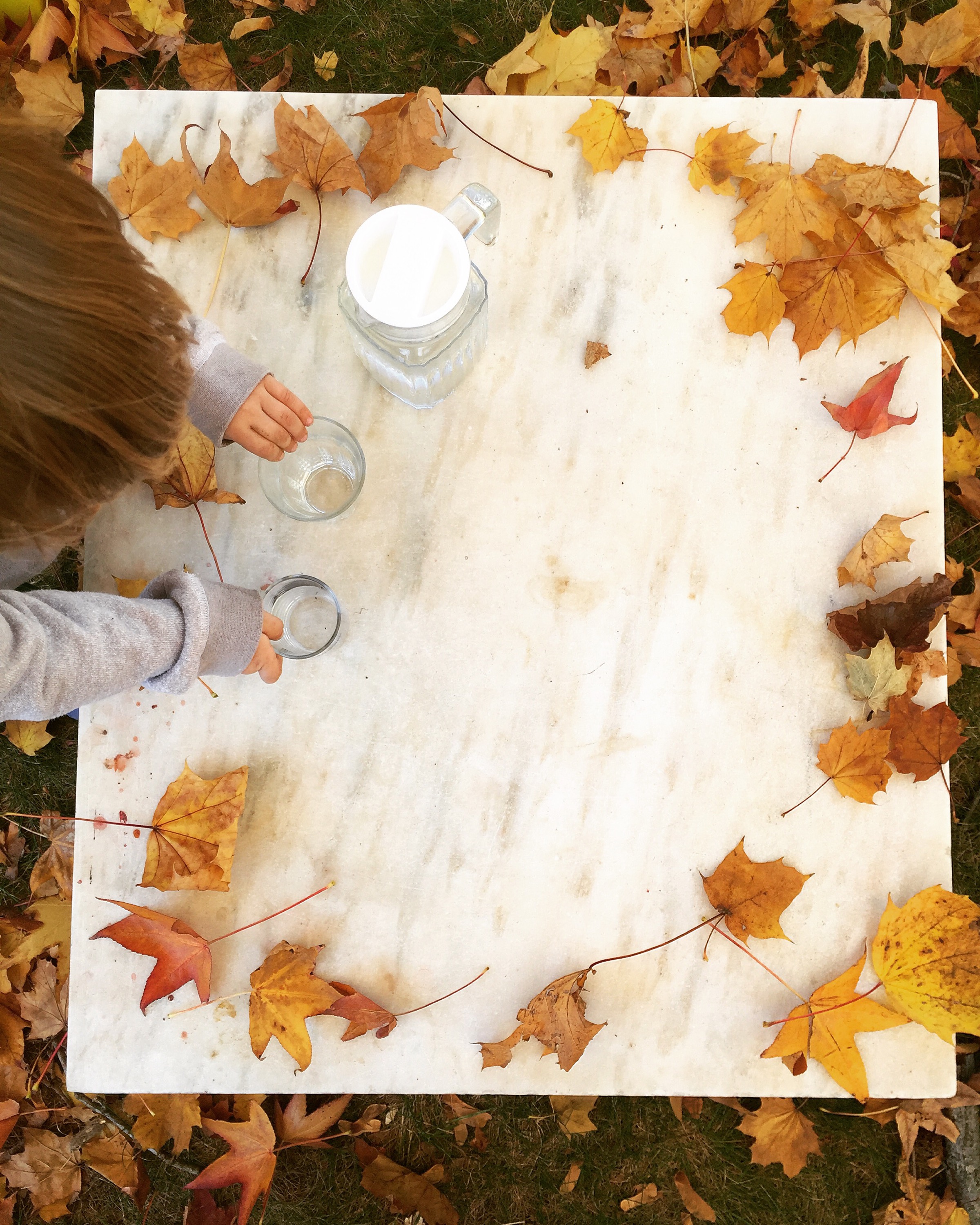 We cleaned up our pouring materials and proceeded to collect some leaves. After a few minutes I noticed this sweet guy was laying out some yellow leaves with great precision and then he set up the pitcher and two glasses and invited me over for a drink. ❤