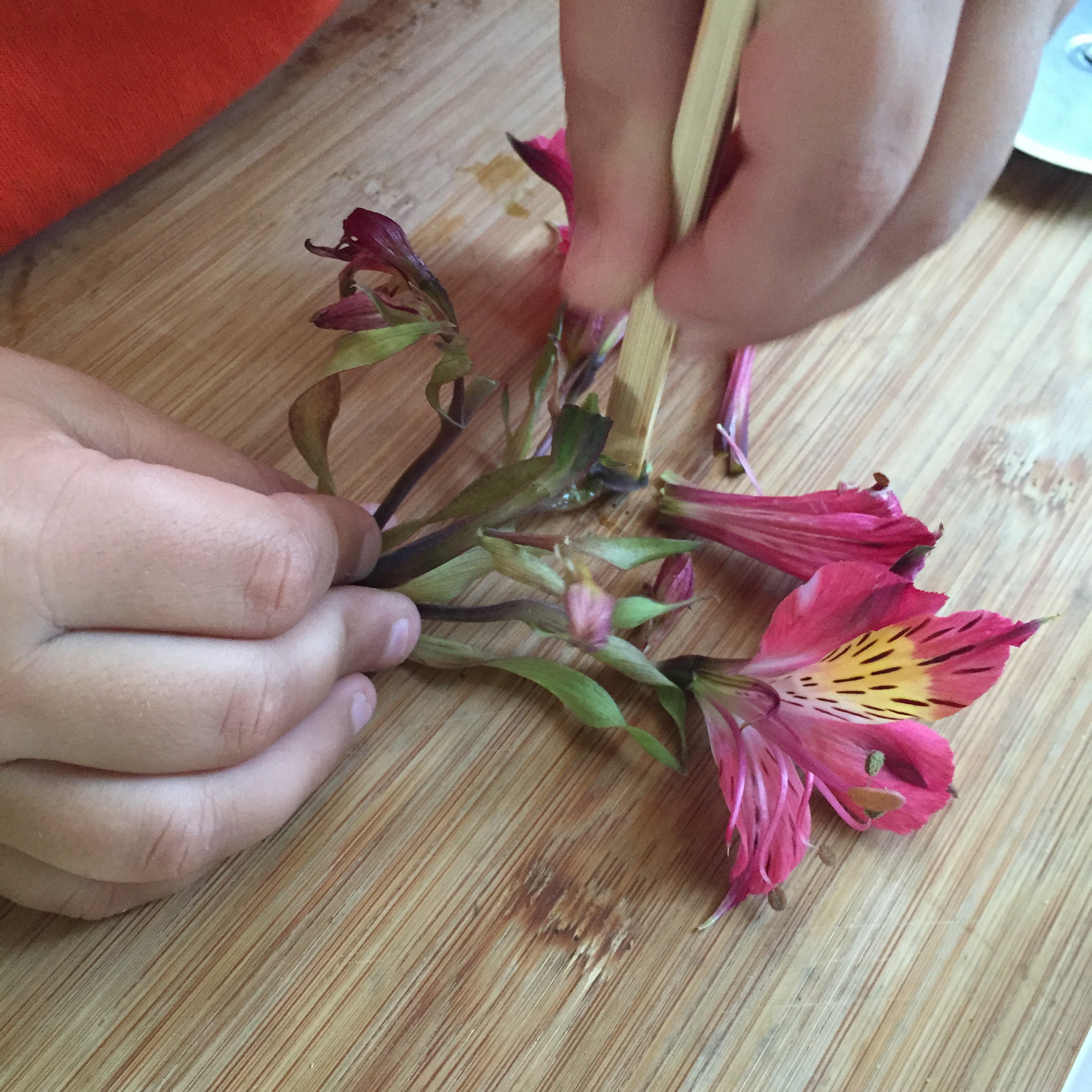 Using some mildly wilted flowers from arrangements we had in the house, I set up an invitation to explore for my boys, ages 6 and 3 1/2.