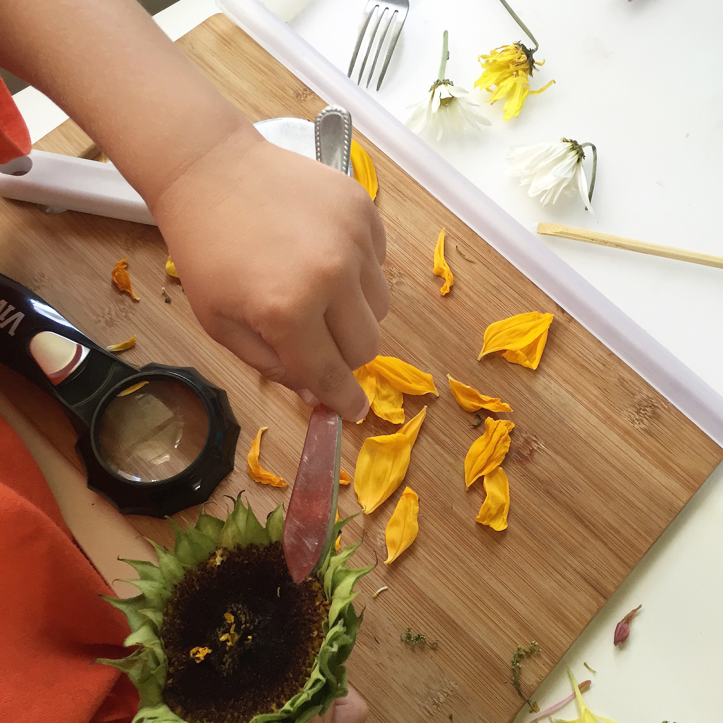 Some of the tools I included for the exploration included a bamboo cutting board, magnifying glass, child friendly knives, forks, chopsticks and a pizza cutter. Other items that I’ve used in the past are lobster pickers, meat tenderizer, potato masher and scissors.